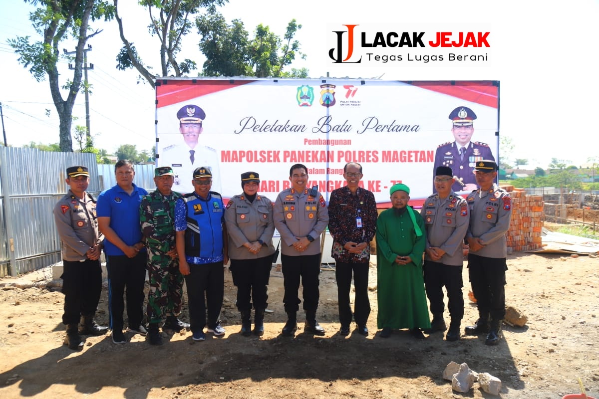 Pelaksanaan pembangunan ditandai dengan peletakan batu pertama oleh Bupati Magetan Dr.Drs. H.Suprawoto, S.H. M.S.i didampingi Kapolres Magetan AKBP Muhammad Ridwan SIK MSi Jum’at (9/6/2023) pekan lalu di lahan Mapolsek Panekan yang baru.
