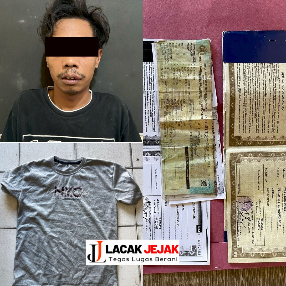 Kini tersangka OP beserta beberapa barang bukti antara lain rekaman CCTV, STNK dan BPKB motor yang dicuri, serta kaos lengan pendek berwarna abu-abu yang digunakan oleh pelaku pada saat melakukan kejahatan.
