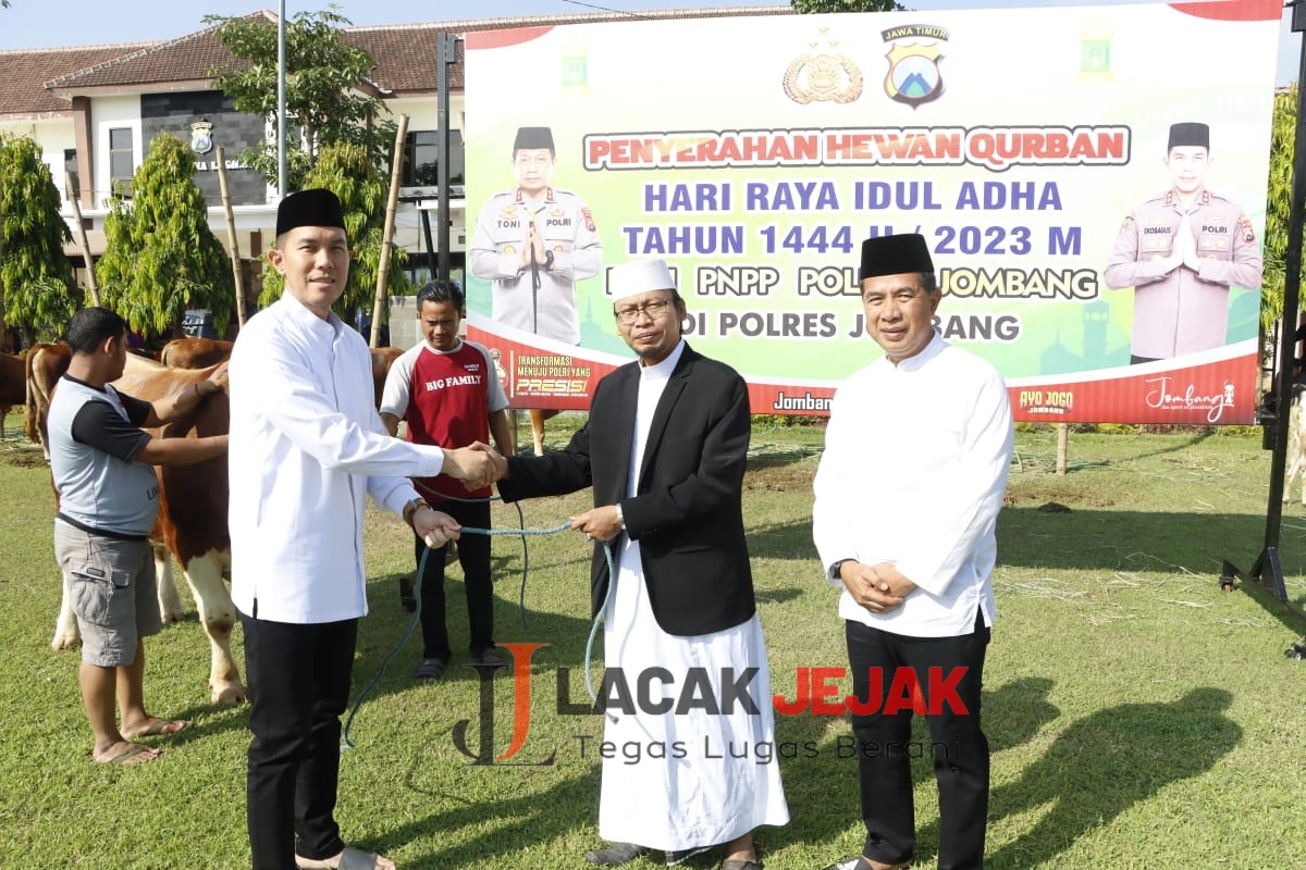 Upacara penyerahan simbolis hewan kurban sapi dilakukan setelah salat Idul Adha oleh Kapolres Jombang AKBP Eko Bagus Riyadi, yang didampingi oleh Wakapolres Kompol Hari Kurniawan, kepada perwakilan Pondok Pesantren di lapangan Mapolres pada hari Kamis, 29 Juni 2023.