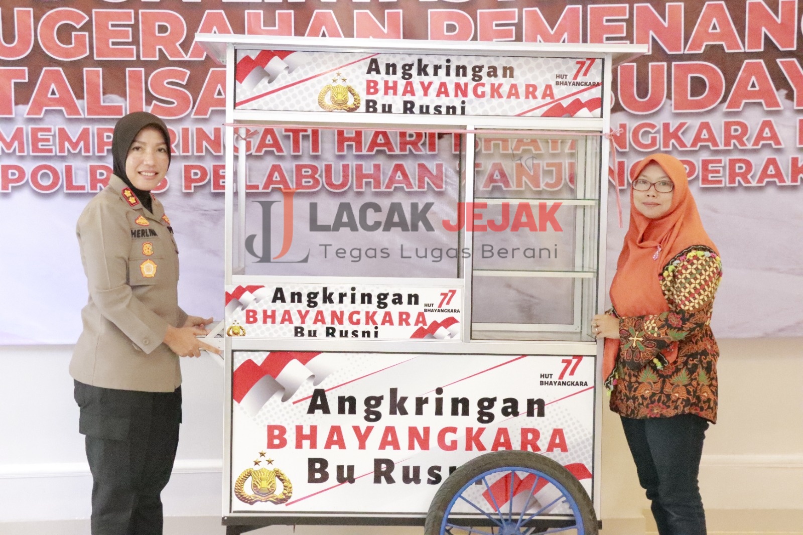 Kapolres AKBP Herlina hadir secara langsung menyerahkan bantuan gerobak usaha kepada tiga pelaku UMKM, yakni, Angkringan Bu Rusni, Warung Nasi Bete Bu Karmini, dan Angkringan Bu Yuli.