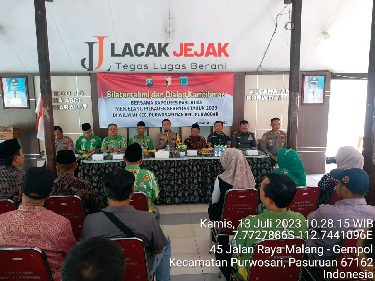 Kegiatan dialog Kamtibmas dihadiri PJU Polres Pasuruan, Kapolsek Purwosari dan Purwodadi, DPMD Kabupaten Pasuruan, Camat Purwosari, Danramil 0819/21 Purwosari, Danramil 0819/22 Purwodadi, Forkopimca Purwosari dan Purwodadi, serta Perwakilan Panitia Pilkades Serentak 2023 Kecamatan Purwosari dan Purwodadi.