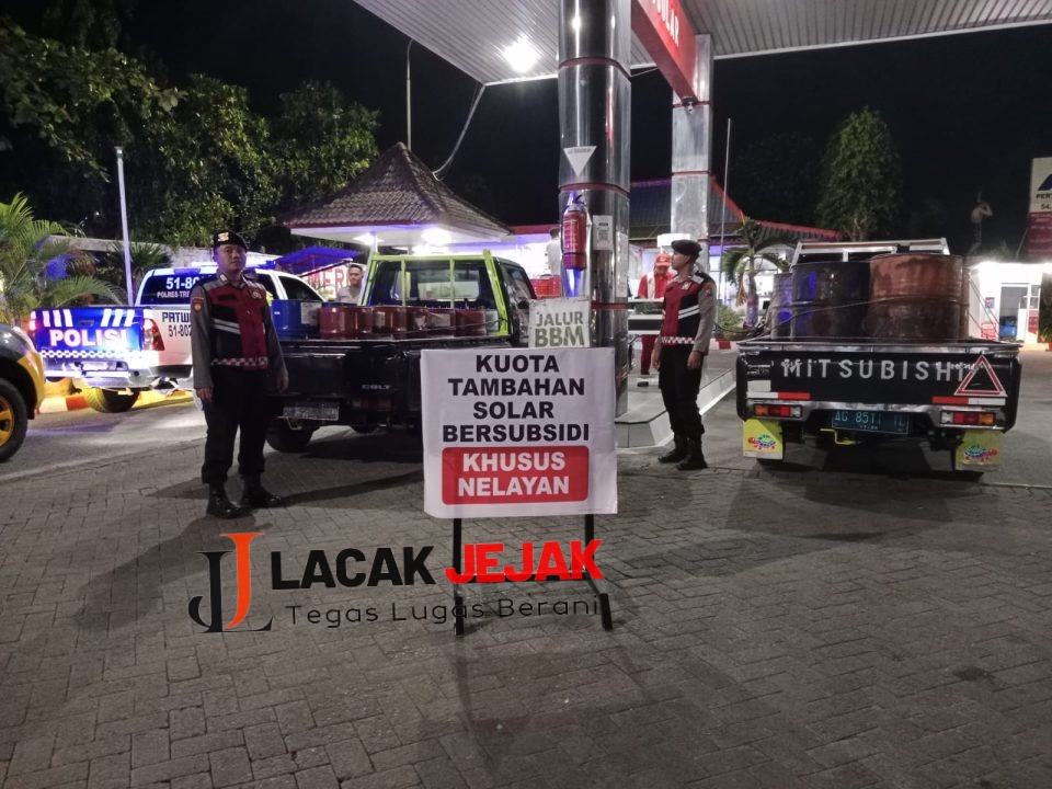 Para petugas kepolisian ini ditempatkan di SPBU Pemkab yang berada di depan Terminal Bus Soradakan, Kabupaten Trenggalek. Sejumlah nelayan nampak sudah mengantri sejak dibuka tepat pukul 19.00 Wib.